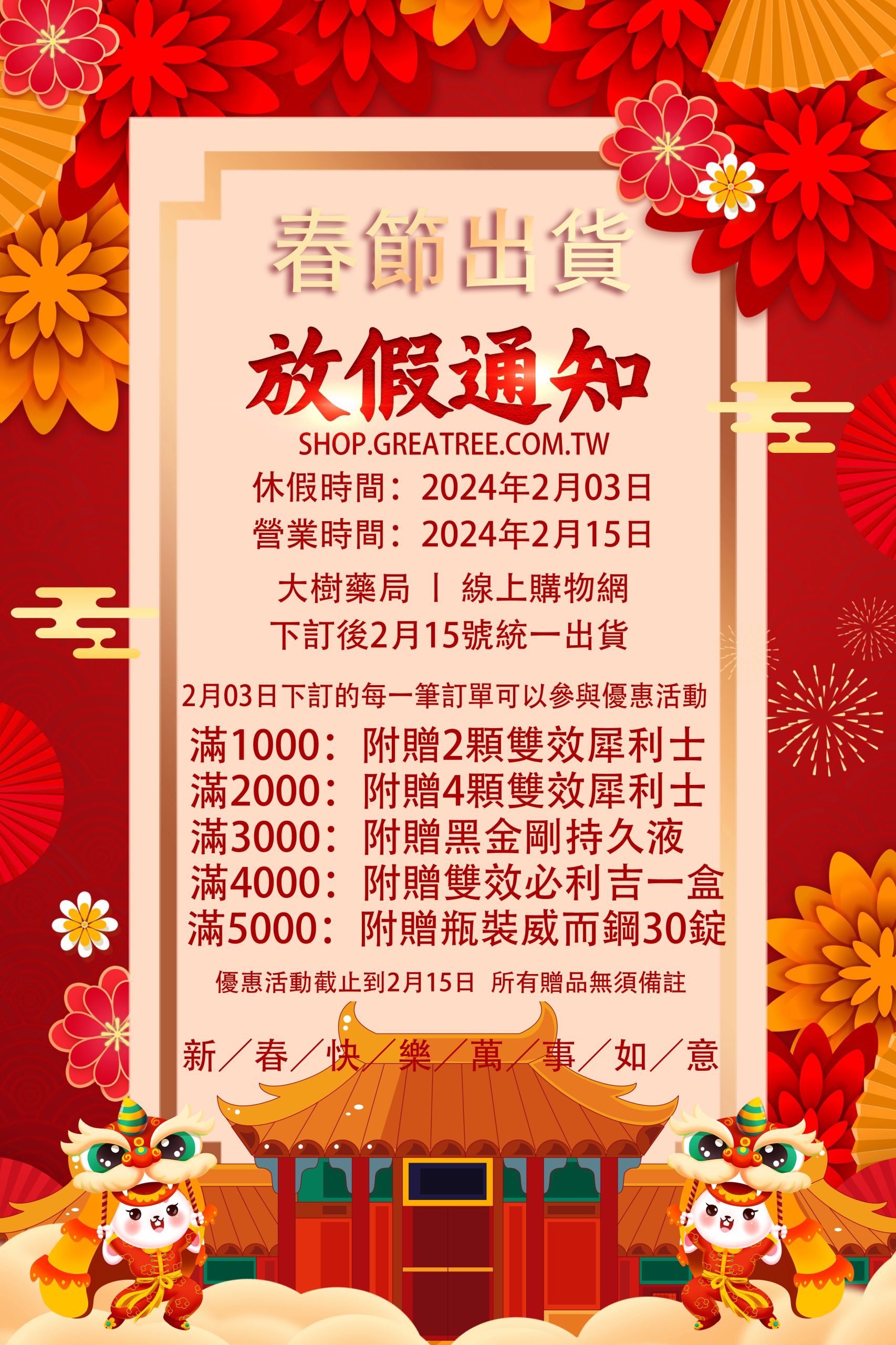 02 2 月 大樹藥局資訊 2024大樹藥局年節服務公告丨春節優惠大酬賓!! 2024 年 2 月 2 日 作者 大樹購物網 0 評論 春節大樹藥局年節下訂公告 親愛的客戶您好: 因應2024春節假期前夕下訂通知,貨物配送服務調整如下,再煩請民眾留意,謝謝。 2月3日-2月15日 官網期間:官網可以正常下單(2月3日-2月15日)在官網下訂的每一筆訂單,只要滿額就有贈品相送! 大樹藥局春節優惠 滿... 繼續閱讀