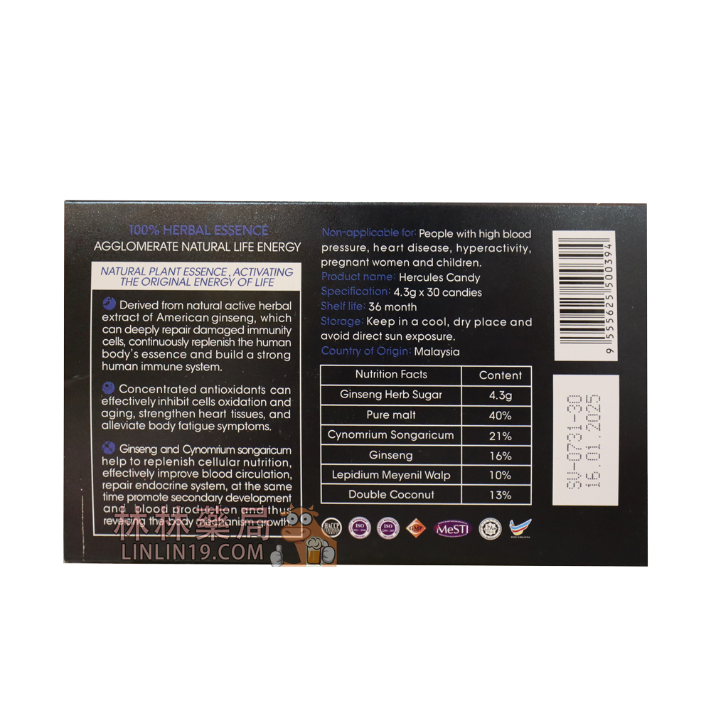 大力神椰子糖(Hercules)歷經15年研發而成,也是馬來西亞原裝進口的一款精力糖,在台灣也叫悍馬糖、hamer糖、汗馬精力糖。汗馬糖主要成分為鎖陽、人參,主要功效是補益陽氣,養筋健骨,補氣養血,緩解血虛型便秘,汗馬精力糖由於快速補充人體細胞營養,延緩老化進程非常有效,數年來已成為運動員首選的細胞營養產品。